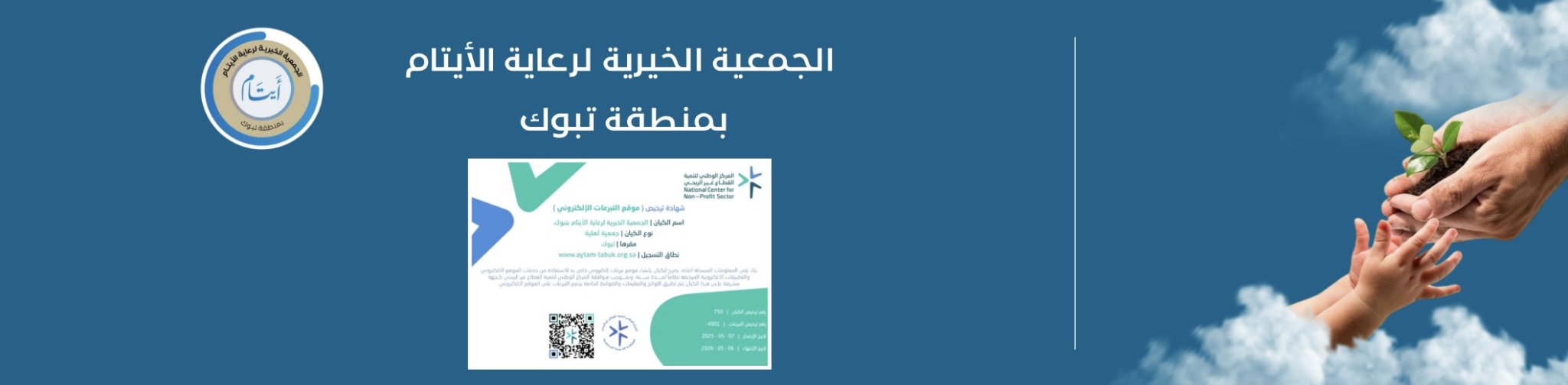 هي جمعية خيرية لرعاية الايتام بمنطقة تبوك إيماناً من المؤسسين بأهمية وجود جمعية تُساهم في الإرتقاء و تُعنى بالأيتام أبناء هذا الوطن الغالي في شتى مناحي الحياة و تساعدهم في صقل مواهبهم و قدراتهم و تساهم في تأهيل اليتيم و رفع مستواه من خلال التنمية على كافة الأصعدة التعليمية و الاجتماعية و الاقتصادية ليكون عضوًا فعالًا بالمجتمع